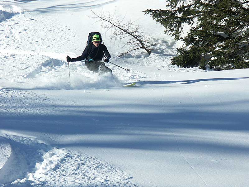Für die Abfahrt hält man sich unterhalb der Gipfelkuppe links, bis man einen oben weitläufigen und nach unten hin enger werdenden Graben erreicht. Durch diesen schwingt man hinunter, bis man den Anstieg zum Halssattel erreicht hat. Es lohnt sich, vom Halssattel weiter nach oben zu steigen, bis man die Kuppe des Halskogels erreicht hat. Von hier gibt es eine schöne Abfahrt hinunter zu den Stubwiesalmen und wieder zurück zum Ausgangspunkt. Dass die Fahrt mit dem kurzen Schlepplift hinauf zur Abfahrtspiste im Preis der Bergfahrt mit der Standseilbahn nicht inkludiert ist verärgert nicht nur uns. So kleben wir noch einmal die Felle für den kurzen Anstieg an und über die Piste schwingen wir zurück ins Tal.